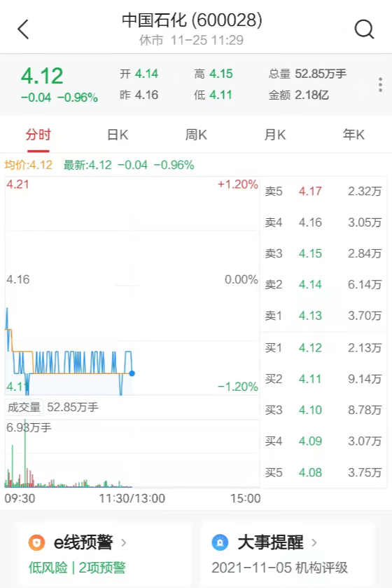 截至今日(11月25日)早盘,中国石化上涨0.96%,现价4.12元/股。