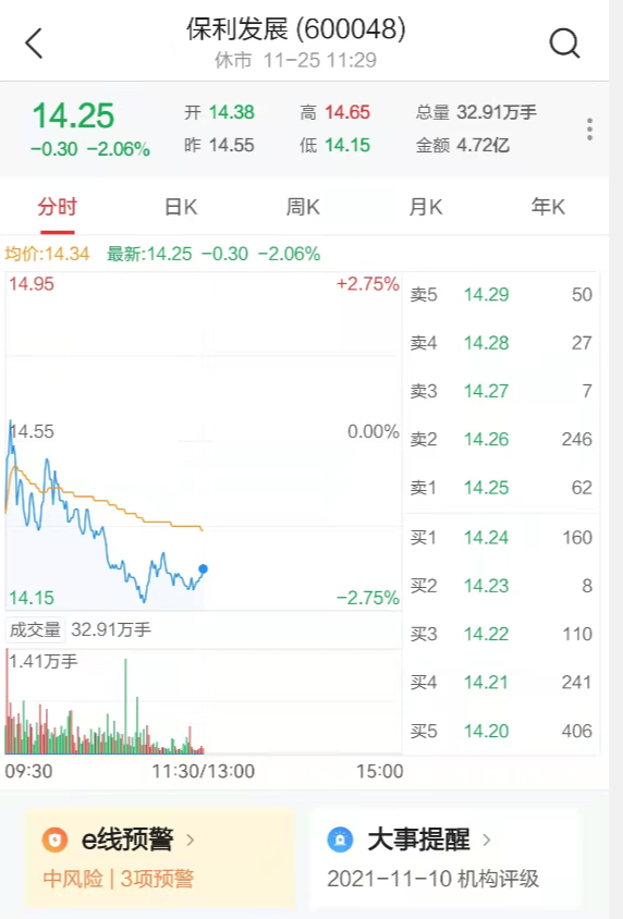 二级市场上,自8月份以来,保利发展股价反弹超过50%。截至上午收盘,该股下跌2.06%至14.25元/股。