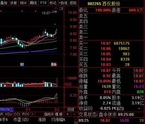 今日早盘,西仪股份再次涨停,开盘时涨停板封单高达607.5万手,约合资金61.2亿元,比公司市值高出2倍有余。这意味着即便公司持有者全部抛售,封单照样可以接住,侧面反映出市场资金对其青睐程度。由于周末释放的重组利好刺激,本周一该股已经录得一字涨停板,最新股价创年内新高。