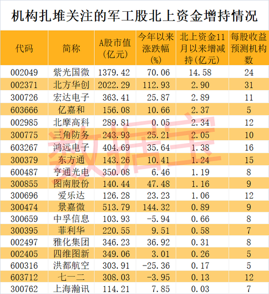 数据宝统计显示,共有43只军工概念股获机构预测今后三年净利润增速均超30%。预测增速均值最高的前五只股票分别是四维图新、奇安信-U、雅化集团、光力科技、紫光国微。按照成交均价粗略计算,11月以来,这些股票合计获得北上资金增持31亿元,其中紫光国微、北方华创、宏达电子、亿嘉和、北摩高科、三角防务等6股获增持超2亿元。