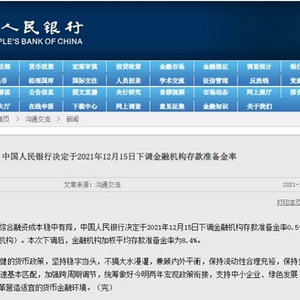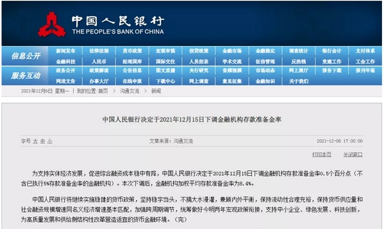 12月6日,央行官网发布通知称,为支持实体经济发展,促进综合融资成本稳中有降,中国人民银行决定于2021年12月15日下调金融机构存款准备金率0.5个百分点(不含已执行5%存款准备金率的金融机构)。本次下调后,金融机构加权平均存款准备金率为8.4%。