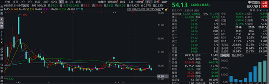 中芯国际自2020年7月16登陆上交所科创板,首日即创出了95元的历史新高,随后股价震荡回调,在2020年9月29日创始了49.45元的低点,随后展开一波反弹。今年的8月6日,曾创出74.9元的阶段高点,随后再度回调。8月6日至今,该股累积下跌19.45%。截至12月15日收盘,该股报54.13元,当前市值1961亿元。
