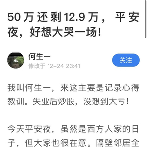 年初还有20多万,如今负债十几万。早过了而立之年,上有老下有小!漂泊在大城市的某山啦卡的角落,还得租房。本来失业后,家里就少了一份收入来源,本想借着股市发个财致个富,没想到却成了家庭的累赘,亲戚们的笑柄!