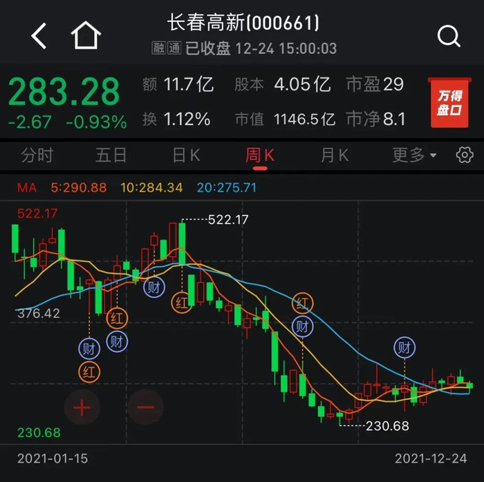 不过5月后长春高新一路走低,截止至12月24日收盘,股价相较最高点几近腰斩。