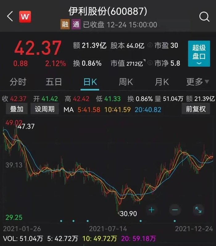更糟糕的是,当中还有20来万是向亲戚借的,我自己的才20多万,东拼西凑好不容易凑够了50万。主要就是为了开通科创板,结果还没来得及开通,就亏掉了第一把,非常幸运的搭上了伊利股份的大翻车行情!