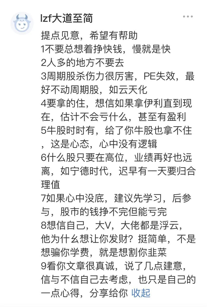 也有人建议:周期股杀伤力很厉害,PE失效,最好不动周期股;如果拿伊利直到现在,估计也不会亏什么。有盈利5牛股时时有,给了你牛股也拿不住,这是心态,心中没有逻辑,什么股只要在高位,业绩再好也远离,如宁德时代,迟早有一天要归合理值。
