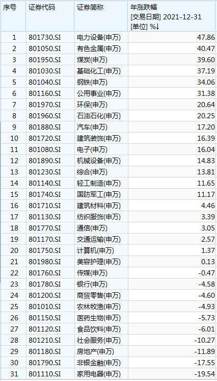 以新版申万行业划分来看,截至12月31日收盘,电力设备行业今年整体上涨47.86%,涨幅高居一级行业首位。