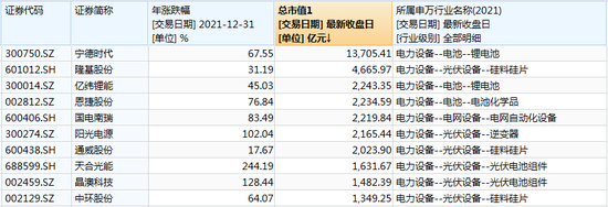 行业内市值排名前十的个股全部收获上涨,宁德时代全年上涨67.6%,阳光电源、天合光能、晶澳科技年线涨幅更是超过100%。