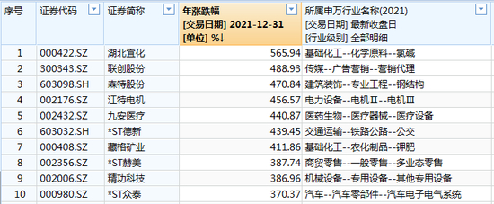 2021年A股十大牛股正式出炉。剔除年内上市的次新股,湖北宜化以全年565.94%的巨大涨幅拔得头筹。联创股份、森特股份、江特电机、九安医疗等年线涨幅均超过400%。