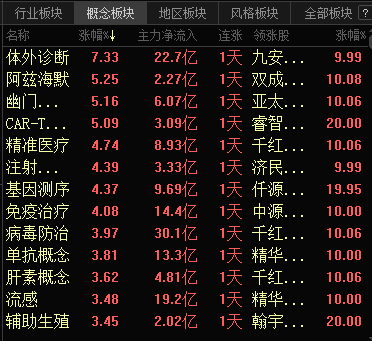 虽然有国际医学的大利空,但是并未影响到今天医药医疗板块的热度,放眼看去,全是相关的个股领涨,两市概念板块涨幅的前13名也都是它们,也算是近期的一大奇观了。