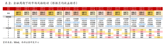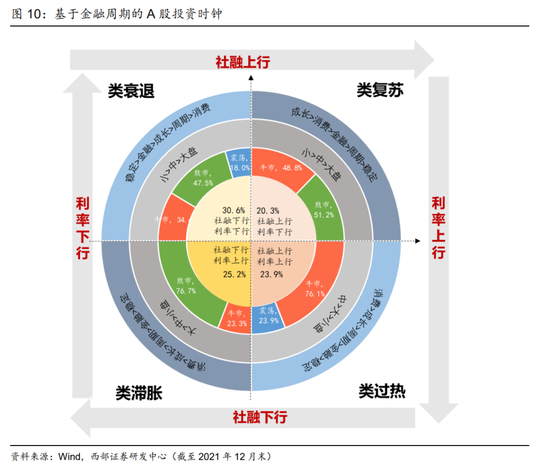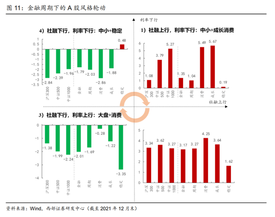 随着国内政策由宽货币到宽信用的推进,未来可以预期的宏观环境将是社融逐步企稳回升而利率震荡筑底,对应我们研究框架中的“类过热”环境。自2008年起,不同金融周期阶段大类资产与风格表现呈现出不同特征:1)类复苏:社融上行,利率下行往往对应经济触底复苏,政策转宽,股商机会开始显现,中小盘+成长消费相对更好,成长与消费风格月均回报分别达到5.67%与5.49%;2)类过热:社融上行,利率上行期间,股商双牛概率走高,A股行业普遍上涨,其中消费相对表现更胜一筹,月均回报达到4.25%,市场风格也从小盘领先转向均衡;3)类滞胀:社融下行,利率上行期间,基本面继续回暖,刺激政策退出,往往出现股熊商牛的格局,A股风格切换至大盘,消费相对抗跌;4)类衰退:社融下行,利率下行期间,往往出现股商双熊,A股仅稳定风格相对收益较好。