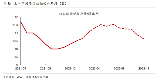 宽信用仍然是上半年最确定的宏观环境。依据西部宏观团队预测,2022年社融年内高点或为11.5%,年底增速有望达到10.7%。在《天量社融回应稳增长质疑》报告中,西部宏观团队认为2022年社融新增规模有望达到33.5万亿,2022年底社融余额同比增速有望达到10.7%的水平。社融口径的人民币贷款有望在2022年达到全年22万亿左右的水平,比2021年的19.95万亿,同比多增2万亿左右。根据今年财政前置的特点,社融同比增速高点在三季度左右出现,增速有望录得11.5%的水平。