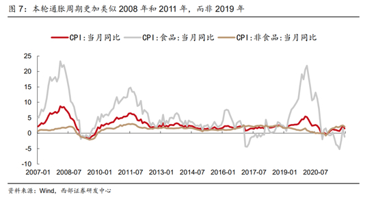 本轮通胀周期更加类似2008年和2011年,而非2019年。从3轮较为明细的通胀周期来看,我们可以看到2008年,2011年和2019年三轮周期存在较大的差异性,前两轮通胀周期中,油价在经历了上一年度(2007年和2010年)价格修复性中枢上移后,在次年形成二次冲击,推动了全面通胀的形成,也最终导致了货币政策的阶段性收紧。而从2019年情况来看,由于其推动CPI上行的主要驱动力来自非洲猪瘟引发的猪价大幅上行,相对温和的油价没有引发CPI非食品项的大幅上涨,所以货币政策并未出现全面转向。而从当前的环境来看,我们认为此轮通胀更加类似于前者而非后者。