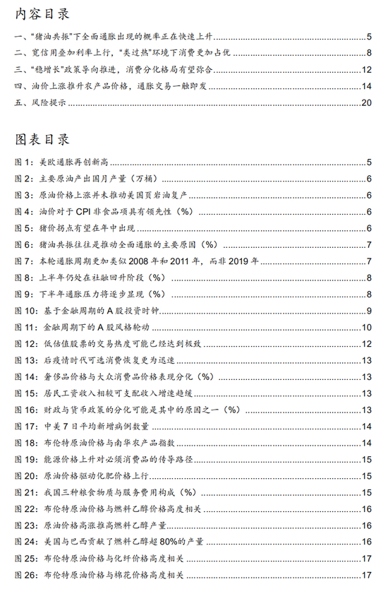 在当下时点,我们认为作为全年主线的通胀交易已经提前启动。在去年11月28日发布的年度策略《变中求其一,动中求其定》中,我们明确指出“美国页岩油产能释放依然缓慢,油价中枢易上难下,国内猪周期下半年有望回升,通胀的影响将在年中逐步显现”,同时“不要忽视供应链紧张的中长期影响”,“未来供应链紧张向其他传统产业进一步传导的风险仍然存在”,在这样的背景下,“必须消费品价格传导将是最具确定性方向”。目前来看,受到欧洲地缘冲突担忧的影响,我们前期的判断正在得到加速验证。随着近期市场对于宏观环境的不断校准和超调,我们认为最终可以预期的市场环境将是“类过热”而非市场当前普遍交易的滞胀或衰退,这样的环境下消费风格将取得更为确定的超额收益,同时结合政策导向变化,以及新一轮猪周期的启动,与通胀关系更为密切的必须消费品将成为今年市场交易的主线。