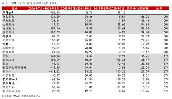 在近三轮CPI上行阶段,申万二级行业中,盈利与通胀保持较高相关性的行业均取得了较为确定的绝对收益。回顾过去2008年,2011年和2019年的三轮CPI大幅上行周期,与通胀保持直接相关性,或者说本身就是构成通胀上行的推动因素的行业往往也是能取得确定性收益的行业。
