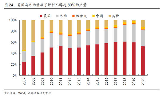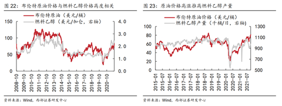 1)燃料油替代品燃料乙醇对玉米、甘蔗及食糖的价格传导。从2008年以来价格走势来看,布伦特原油价格与燃料乙醇价格高度相关,原油价格高企会推动燃料乙醇扩张产能。当前燃料乙醇的生产主要依赖美国与巴西,两国2020年占全球产量比重分别高达52.72%和30.02%。从历史上看,油价上行往往推动美洲国家的酒精燃料加工产业,进而引发全球饲料和白糖供给的短缺。