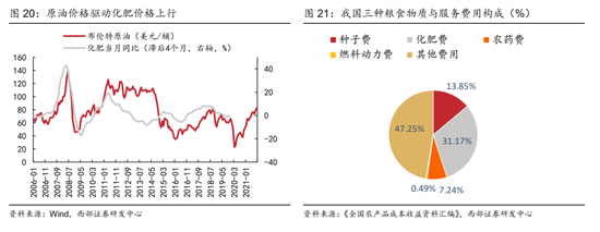 一是从成本驱动角度来看,原油价格上涨推高化肥等农产品成本,进而驱动水稻、小麦、玉米等主粮价格上涨;由于化肥生产依赖于煤、油、气等化石能源,化肥价格在原油价格上行阶段会出现较为明显的反应。从领先滞后关系来看,布伦特原油价格大致领先化肥价格3-4个月,化肥价格的上涨也将有力推高主粮的生产成本。