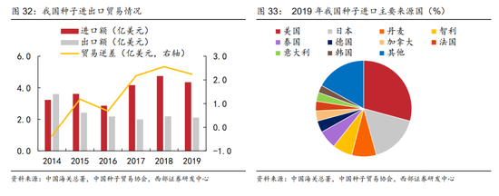 我国种业现状而言,种业作为农业产业链的起点直接关系到粮食安全,是粮食的 “芯片”。当前我国种业仍较为依赖进口;近年来,我国种子进出口贸易逆差不断扩大,2019 年我国种子进口额达 4.35 亿美元,贸易逆差高达 2.24 亿美元。整体而言,我国种业大而不强,自主创新能力和国际竞争力较弱,很多农作物缺乏替代品种,仍需依赖进口。从进口来源来看,当前美国、日本为我国种业进口前两大来源国,2019 年我国分别从美国和日本进口 1.27 亿美元和 0.72 亿美元种子,合计占我国种业全部进口量比重约 45.75%。