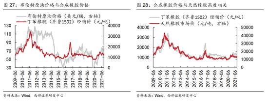 3)合成橡胶对其替代品天然橡胶的价格传导。合成橡胶以二烯烃和烯烃为单体聚合而成的高分子材料,以石油、天然气为原材料。当原油、天然气价格上涨时,合成橡胶成本会显著上行,进而推高合成橡胶价格。橡胶行业的下游轮胎等制造商往往根据两者的价差来确定最终产成品中两类橡胶的使用比例,因而合成橡胶的价格上涨往往也会带来对天然橡胶的需求增加,进而通过替代效应完成对天然橡胶的价格传导。