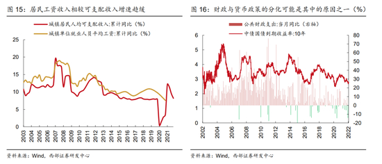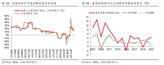 一个可以借鉴的例子是2011年。从2008年金融危机之后来看,当时在货币和财政的全面刺激下,整体呈现需求的快速复苏,而与当下类似的是,可选消费的复苏较必须消费更加明细,到2009年下半年,可选消费已经恢复到危机前水平,而必须消费的恢复依然偏弱。从价格指标来看,2009-2010年期间反映高端消费的富豪消费价格指数的反弹也明显好于同期的CPI水平。而到2021年,随着货币政策逐步转向收紧,而财政仍在持续发力的环境之下,居民工资收入仍保持较快增长,推动了必须消费品的需求进一步修复,而从价格指标来看,CPI仍保持上行而高端消费品价格已经开始下滑。虽然与当前情况并不完全相同,但是仍有借鉴意义。