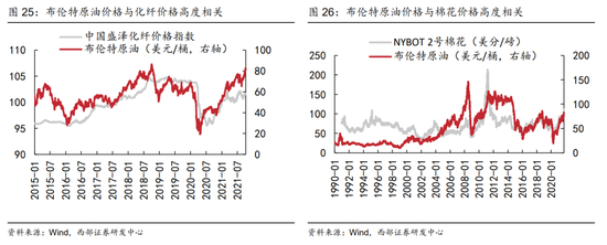 2)化纤替代品棉织品对棉花的价格传导。化纤生产中主要原料之一化工产品PTA与原油价格高度相关,带来了油价向化纤价格的传导。而一旦化纤价格过高,则棉织品的替代效应将逐步显现,此时市场对于棉花的需求增加将进一步推高棉花的价格。