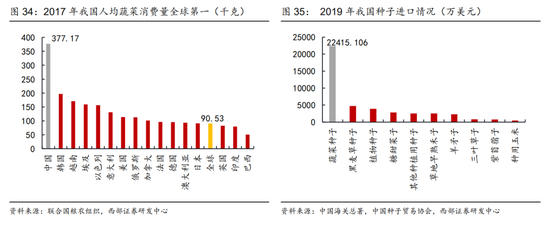 我国是蔬菜消费量第一大国,蔬菜需求刚性较大,而蔬菜种子严重依赖国外进口。根据联合国粮农组织数据,2017年我国人均蔬菜消费量达到377.17千克/人,高居全球第一,是全球平均水平的4倍。同为13亿人口大国的印度,人均蔬菜消费量仅为79.83千克/人,约为中国的五分之一,相比之下我国蔬菜消费需求的刚性和负担比较明显。然而,消费需求最高的蔬菜种子却严重依赖国外进口。蔬菜种子是我国种子进口的第一大类别,2019年我国蔬菜种子进口额达到2.24亿美元,高于其余九类种子的进口额之和,在种子进口中扮演了非常关键的角色。