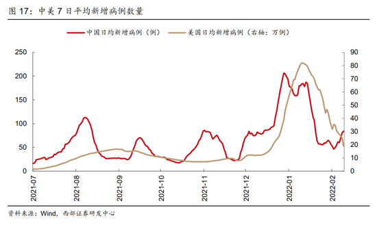 线下消费:疫情拐点叠加政策利好背景下预期改善。一方面,国际疫情形势的好转有助于提振线下消费信心。奥密克戎变种病毒导致的这波疫情高峰将至,1月中旬以来美国的新增新冠病例开始下降,日均新增病例从1月中旬80万例的高位回落至当前的20万例左右;国内疫情也回归至动态清零。另一方面,稳增长压力与“十四五”规划下促消费政策有望落地。节前国家出台十方面举措促消费,国务院日前印发《“十四五”旅游业发展规划》,提出“有序促进入境旅游、在疫情防控常态化条件下创新提升国内旅游,在国际疫情得到有效控制前提下分步稳步发展出境旅游”。