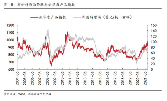 大宗商品价格上涨对于必须消费品的价格传导将是最具确定性方向。虽然受制于需求偏弱,大宗商品价格上涨最快的阶段可能已经过去,但是考虑到供给恢复的迟缓,以及供应链紧张催生的预防性补库需求的增加,以原油为代表的工业品价格仍将维持在较高水平。从历史上来看,原油价格上涨对农产品价格有着较为显著的传导,2004年以来布伦特原油价格在2007年、2010年、2016年和今年的快速上行均显著推高了南华农产品指数。