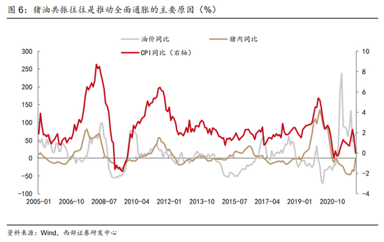 猪油共振往往是推动全面通胀的主要原因。从历史上看,全面通胀的形成往往来自于油价大幅上涨后,推升次年基础农产品价格后,叠加油价高位二次冲击,形成的猪油共振格局。如果仅仅只是油价上行推升的农产品价格上行,对于通胀的影响将更多是结构性的,也无法形成全面通胀压力。