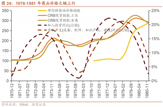 在资本开支大幅上行期间,以工业品、金属及原油为代表的商品价格大幅上行。1976-1981年,原油价格上行180.7%,工业品价格指数上行47.4%,金属价格指数上行54.4%。