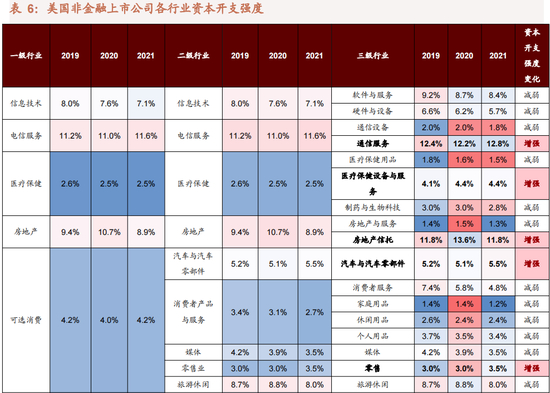 3)医疗保健。新冠疫情影响下,医药产业链资本开支增长迅速,近两年包括医疗保健用品、医疗保健设备与服务、制药与生物科技行业均保持较高资本开支增速。