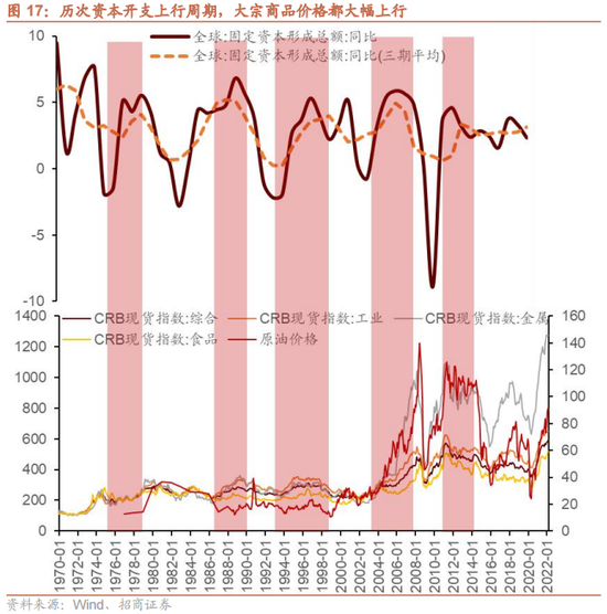 历次资本开支上行周期,大宗商品价格都大幅上行。当企业或者政府扩大资本开支,将扩大对上游原材料的需求,拉动商品价格大幅上涨,这在1970年以来的五次资本开支上行周期中均有所表现。