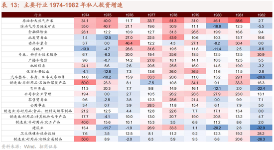 盈利恢复带动资本开支增长。随着企业盈利的恢复,1977年企业投资占固定资产投资的比例上升,这一增长一直持续到1983年,意味着企业资本开支的提升。从私人投资的同比数据看,设备、软件和建造的投资同比增速在1975年见底,1976年开始回升,一直持续至1981年。