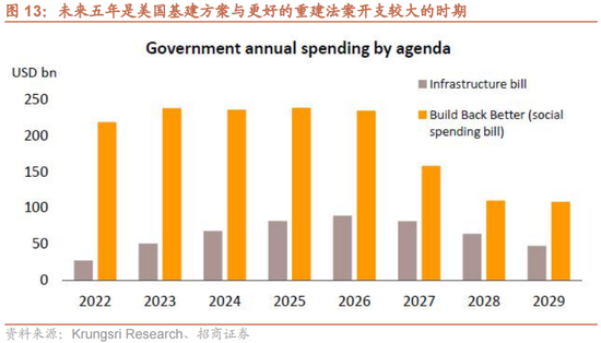 美国政府已经通过了1.2万亿美元的基础设施法案,以更新交通、公用事业和宽带。支出将从2022年开始,并在未来4年达到峰值。此外,国会正在讨论1.75万亿美元的社会安全和气候政策法案,这可能会刺激对环境友好和替代能源部门的投资浪潮。