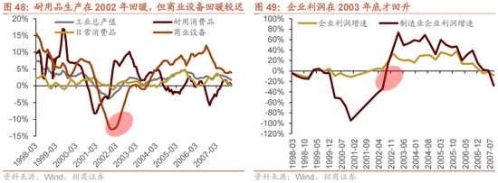 耐用品生产在2002年回暖,但是企业利润与商业设备生产在2003年底才回升。从工业生产来看,与房地产相关的耐用品生产在2002年已经实现了较高的增速,但是商业设备在2002年整体还是保持负增长。2003年三季度,制造业企业利润告别负增长,达到13.9%的增速,此后2003年末,商业设备领域的工业总产值才出现较大幅度的上升。