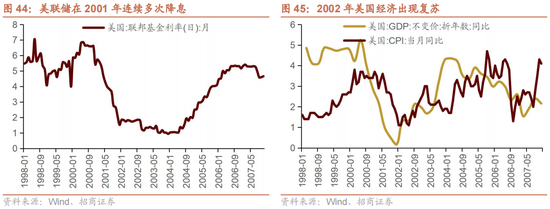 第四轮资本开支的上行起源于互联网泡沫破灭后的经济复苏。90年代末,美国经济进入过热阶段。美联储为了给经济降温连续加息,紧缩的货币政策使得美国经济在2000年明显放缓。美国司法部对微软的反垄断指控引爆了“互联网泡沫”,使得居民财富缩水。2001年,911事件的发生更加使得美国经济迅速放缓。为了应对经济增速的快速下滑,美联储在2001年连续多次降息,联邦基金利率从6.86%下降至2001年底的1.52%,2002年经济出现复苏。