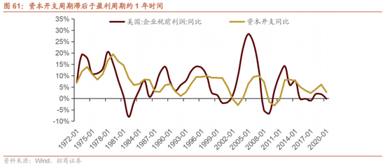 2)美国资本开支周期往往经历这样的过程:经济危机—宽松的财政与货币政策—消费与房地产市场复苏—工业生产复苏—企业补库存(或有)—企业利润恢复—资本开支上行。企业盈利周期领先于资本开支周期,当观察到盈利连续一年甚至更久保持较高增速时,企业会增加资本开支。