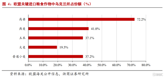 三是乌克兰是重要的“欧洲粮仓”。乌克兰大面积处于平原地区,其中乌克兰大平原面积约为190万平方公里,是世界仅有的4块黑土区之一,占全世界黑土资源的40%,为农业发展创造了优越的条件。2019年,乌克兰谷物出口量达到4065万吨,在全球范围内的占比达到8.7%,全球份额仅次于美国。根据欧盟海关发布的粮食进出口数据,2020-2021市场年度,在参与统计的10种主要粮食作物中,乌克兰在5种作物的进口份额排名中位于前五,是名副其实的欧洲粮仓。