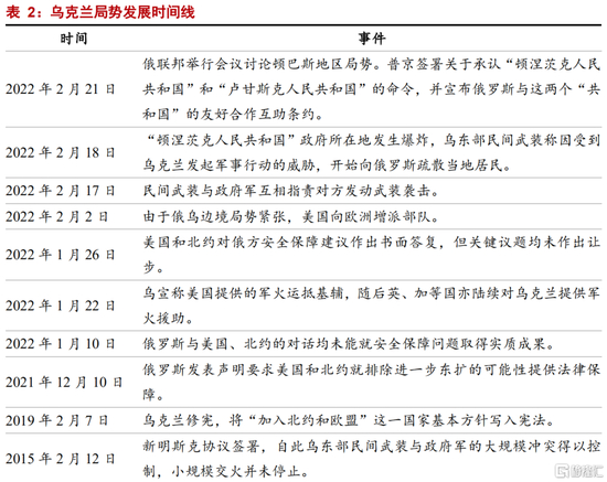 2021年12月,俄罗斯总统普京公布美国与北约的安全保障协议草案并召开新闻发布会,草案针对北约相关问题提出的核心诉求包括:一是北约停止进一步东扩;二是放弃在俄边境附近部署打击性武器;三是北约在欧军事设施回退至1997年的状态(1997年俄罗斯与北约签订《俄联邦与北约相互关系,合作和安全的基本文件》,本份文件中北约认可俄罗斯在欧洲安全中的重要作用;俄罗斯原则上仍然反对北约东扩保持反对但实质默认冷战后北约首轮东扩)。2022年1月,俄罗斯前后与美国、北约就安全保障协议中的相关诉求展开对话;美国和北约也在1月26日回复了俄罗斯关于安全保障建议的诉求,对话和答复中俄罗斯的诉求均未取得实质性进展。至此以后,俄乌关系的恶化开始明显升级,两国开始在边境地区部署军事力量,以美国为代表的美欧国家开始对乌克兰进行军援,冲突逐步发酵至今。