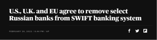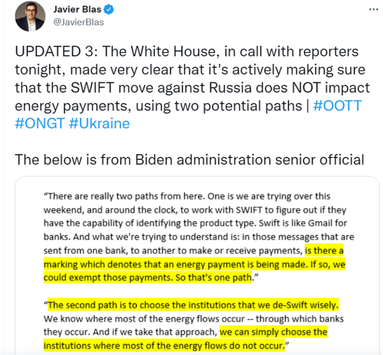 值得注意的是,据外媒报道,这次制裁行动不是将俄罗斯彻底踢出SWIFT,仅仅只是有选择的禁止俄罗斯银行(“select Russian Banks”)使用SWIFT系统,欧盟购买俄罗斯天然气的支付渠道保持开放。