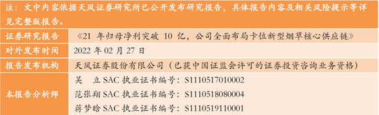 投资建议:根据公司业绩快报,我们微调公司2021-23年的营收为50.8/65.0/85.3(前值为53.6/67.65/87.17)亿元,净利润为10.06/13.4/17.8(前值为10.9/14.2/18.5)亿元。考虑到公司积极卡位新型烟草供应链环节,维持“买入”评级。