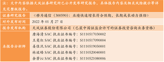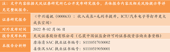 展望未来,2022年是公司战略超越期的开启之年,公司将通过持续的创新投入和数字化变革不断开拓数字经济的想象空间和应用场景。公司在1)运营商核心业务产品竞争力突出,5G无线、核心网、承载网等关键产品全球份额稳步提升,奠定公司中长期成长的基础;2)政企业务加大IT、数字能源等拓展,重点构建服务器及存储、操作系统、数据库等底层竞争力,快速成为百亿级产品,拓展5G行业应用;成立汽车电子产品线;成立数字能源经营部进军新能源市场,打造第二增长曲线;3)消费者业务加大手机品牌建设,新设立智慧家庭产品线,有望稳步成长。