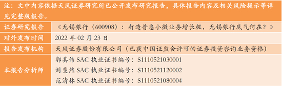 发力小微可有效支撑公司盈利能力继续保持领先优势,当前公司开拓普惠小微业务的决心坚定、内外部优势明显。同时外源性资本补充行在路上,为公司资产扩张打好提前量。我们看好公司未来的业绩成长性,预计2021-2023年归母净利润同比增速分别为19.68%、15.62%和15.13%。截至2022年2月23日收盘,公司股价对应PB(MRQ)为0.89倍,我们给予公司2022年目标PB1.05倍,对应目标价8.61元,维持“买入”评级。