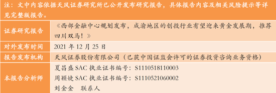 事件:2021年12月24日,人民银行、银保监会、证监会、外汇局等6部门联合川渝两地方政府印发《成渝共建西部金融中心规划》(以下简称《规划》),将成渝建设成为立足西部、面向东亚和东南亚、南亚,服务共建“一带一路”国家和地区的西部金融中心。到2025年,西部金融中心初步建成;到2035年,西部金融中心地位更加巩固。
