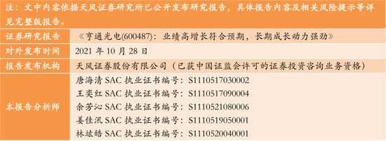 公司2021年前三季度营收298.12亿元,同比增长17.54%,归母净利润为13.16亿元,同比增长50.56%;单季度看21Q3营收为117.55亿元,同比增长18.81%,归母净利润为6.45亿元,同比增长49.70%。业绩高增长预计源于:1)国家海洋战略加速推进以及海上风电快速建设,拉动公司海洋业务快速增长;2)电力业务板块预计稳中有升;3)降本增效,盈利能力提升,其中前三季度毛利率16.46%,同比提升0.49个百分点,净利率4.66%,同比提升1.16个百分点;从三项费用来看,公司21年前三季度三项费用率为7.12%,同比下降1.6个百分点。我们认为,未来随着光通信业务迎来向上增长,预计公司未来数个季度呈较快增长趋势。