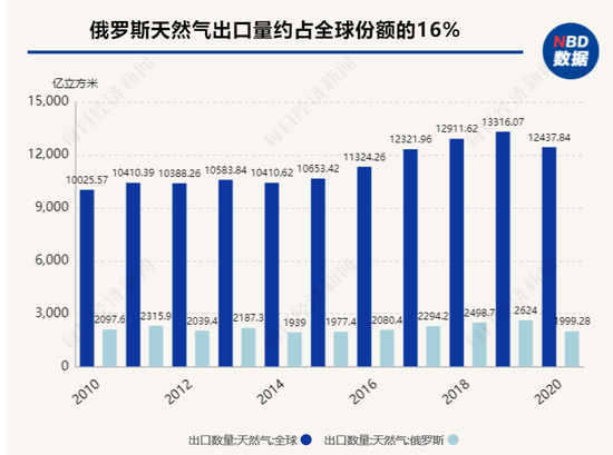 天然气方面,2020年全球天然气总出口量约为1.24万亿立方米,其中俄罗斯天然气出口量为1999亿立方米,占全球天然气出口份额的16%。