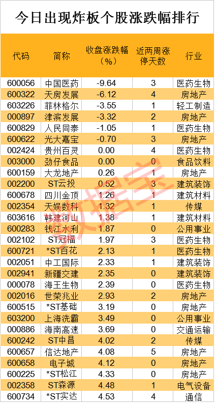 今日两市炸板个股超过60只,炸板率一度高达50%。以收盘价看,光大嘉宝、人民同泰、津滨发展、菲林格尔、天房发展、中国医药盘中均触及涨停,但收盘股价皆翻绿。