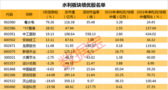 证券时报·数据宝统计,水利板块29股的股价3月平均上涨5.93%,粤水电、*ST围海、国统股份、韩建河山、青龙管业3月上涨幅度均超20%。粤水电的涨幅居首,月内累计上涨79.26%,公司股价今日涨停,上周连续收获5涨停,昨日公司发布年报显示,2021年公司实现营收143.61亿元,同比增长14.13%;归母净利润3.28亿元,同比增长24.45%。今日粤水电的主力净流入额居首,3.18亿元主力流入该股。
