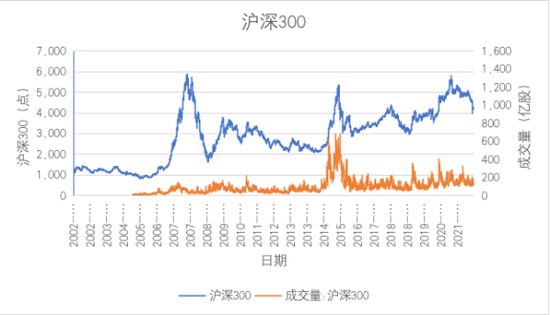 李求索:这两个问题都很难。我也从图表开始,2002年到现在一共二十年的时间,最开始2002到2005年或者再往后一点,从2002年到2012年的十年。最开始的第一个问题,我说基本面的周期,这里面包括经济的周期,经济的周期开始的波长比较长,现在稍微缩短了一些。从股市的周期来看也是类似的情况,这二十年如果分拆,前面的十年波长较长,后面的十年波长稍短。2002年到2005年的时间是比较明显的熊市环境,当时这个市场大概跌了有四年的时间,四年的“漫漫熊图”。看指数,成交的方面,到2005年之前是没有的,因为那时候沪深300这个指数都没有,沪深300是从2005年之后开始有指数,那时候我们重点看的是另外一个宽基指数——上证综指。在2002年到2005年,2005年差不多接近1000点的点位了,当时有很多人在2005年都处于比较明显恐慌的环境。