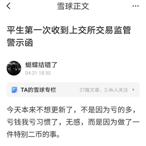 今天本来不想更新了,不是因为亏的多,亏钱我亏习惯了,无感,而是因为做了一件特别二币的事。郁闷得我一整天没吃饭。亏了钱还收到上交所警示函,赔了夫人还折兵。